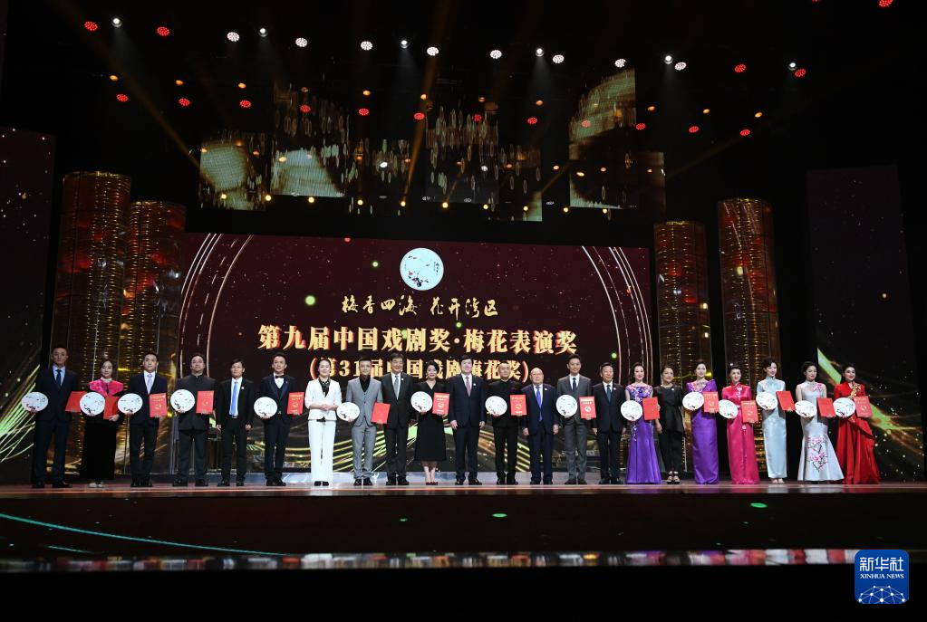 當(dāng)晚,第九屆中國戲劇獎·梅花表演獎(第31屆中國戲劇梅花獎)和第九屆中國戲劇獎·曹禺劇本獎(第25屆曹禺戲劇文學(xué)獎)頒獎典禮在廣州舉行。新華社發(fā)(許建梅攝)