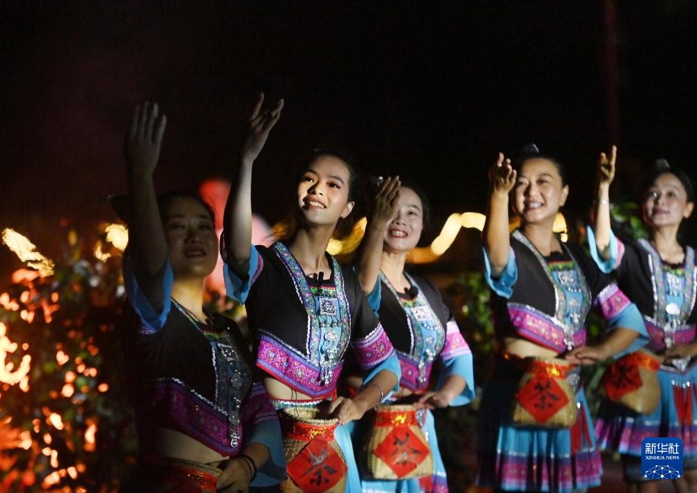9月5日,在梧州市蒼梧縣六堡鎮(zhèn)山坪村同心廣場(chǎng),村民在篝火晚會(huì)上跳采茶舞。