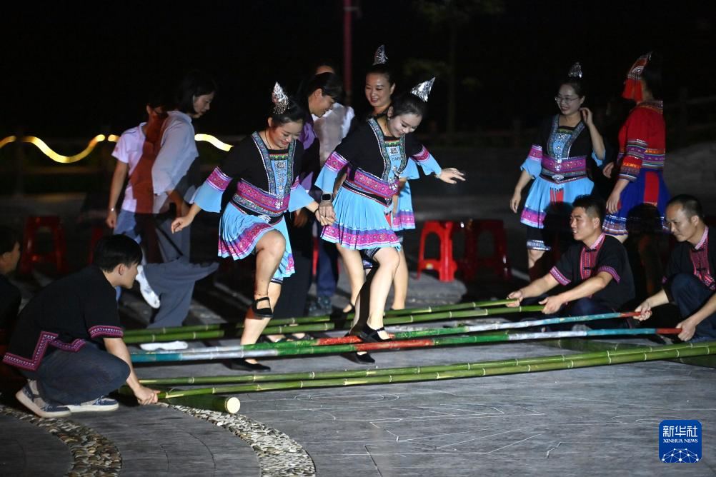 9月5日,在梧州市蒼梧縣六堡鎮(zhèn)山坪村同心廣場(chǎng),各族干部群眾在篝火晚會(huì)上跳竹竿舞。