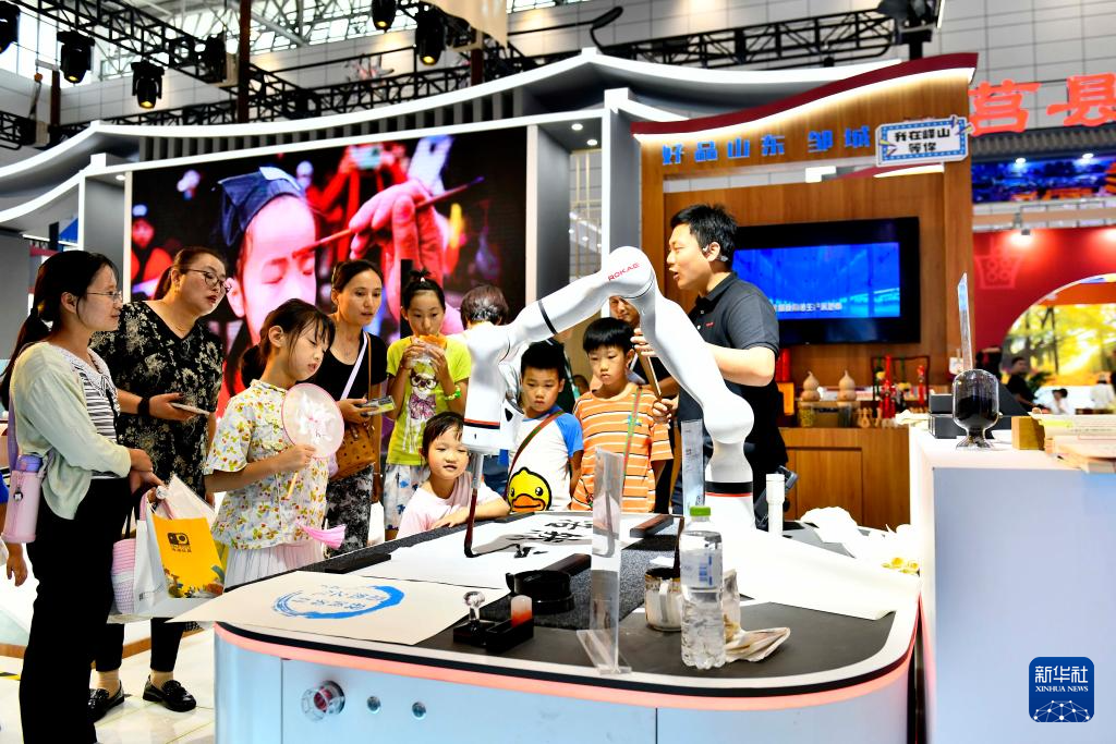 9月16日,在山東國際會展中心,來自濟寧市的參會人員在展示機器人書寫漢字。