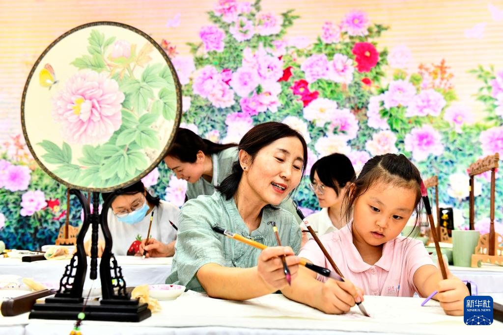 9月16日,在山東國際會展中心,來自巨野書畫院的藝術(shù)工作者姚愛紅教孩子給工筆牡丹畫上色。