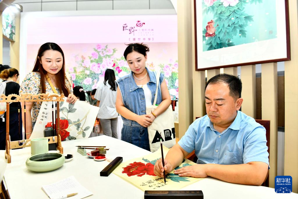 9月16日,在山東國際會展中心,來自巨野書畫院的藝術(shù)工作者侯福常(右一)在展示工筆牡丹畫技藝。