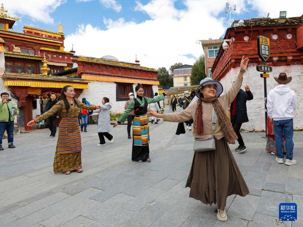 10月10日,游客(前)在理塘縣勒通古鎮(zhèn)跟著當(dāng)?shù)夭刈迦罕娞伹f舞。