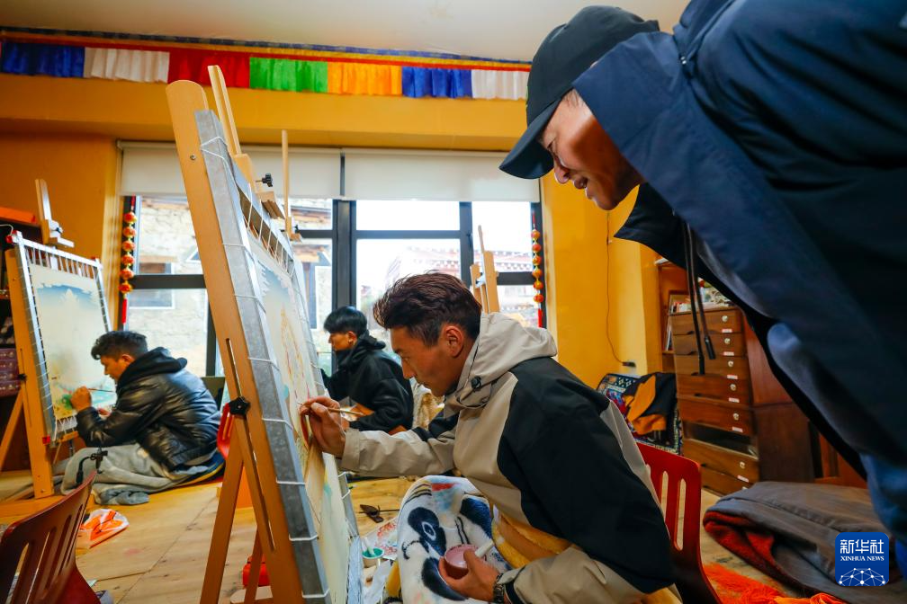 10月10日,游客(右)在理塘縣勒通古鎮(zhèn)的“唐卡館”觀看當(dāng)?shù)厮囆g(shù)家創(chuàng)作唐卡作品。