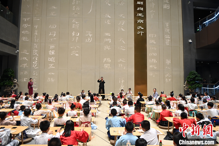 圖為9月7日,小朋友們?cè)谖挥诟拭C蘭州的甘肅簡(jiǎn)牘博物館學(xué)習(xí)書寫簡(jiǎn)牘中的文字。中新社記者 九美旦增 攝