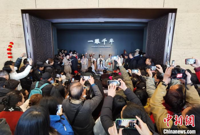 太原北齊壁畫博物館的“一眼千年”展廳,北齊武安王徐顯秀墓就陳列于此。來自文瀛雅樂社和竹里國樂團的樂手,將塤、古琴、琵琶、箜篌、笛子等樂器演繹出《敦煌》《一眼千年》《春節(jié)序曲》,為民眾送福。