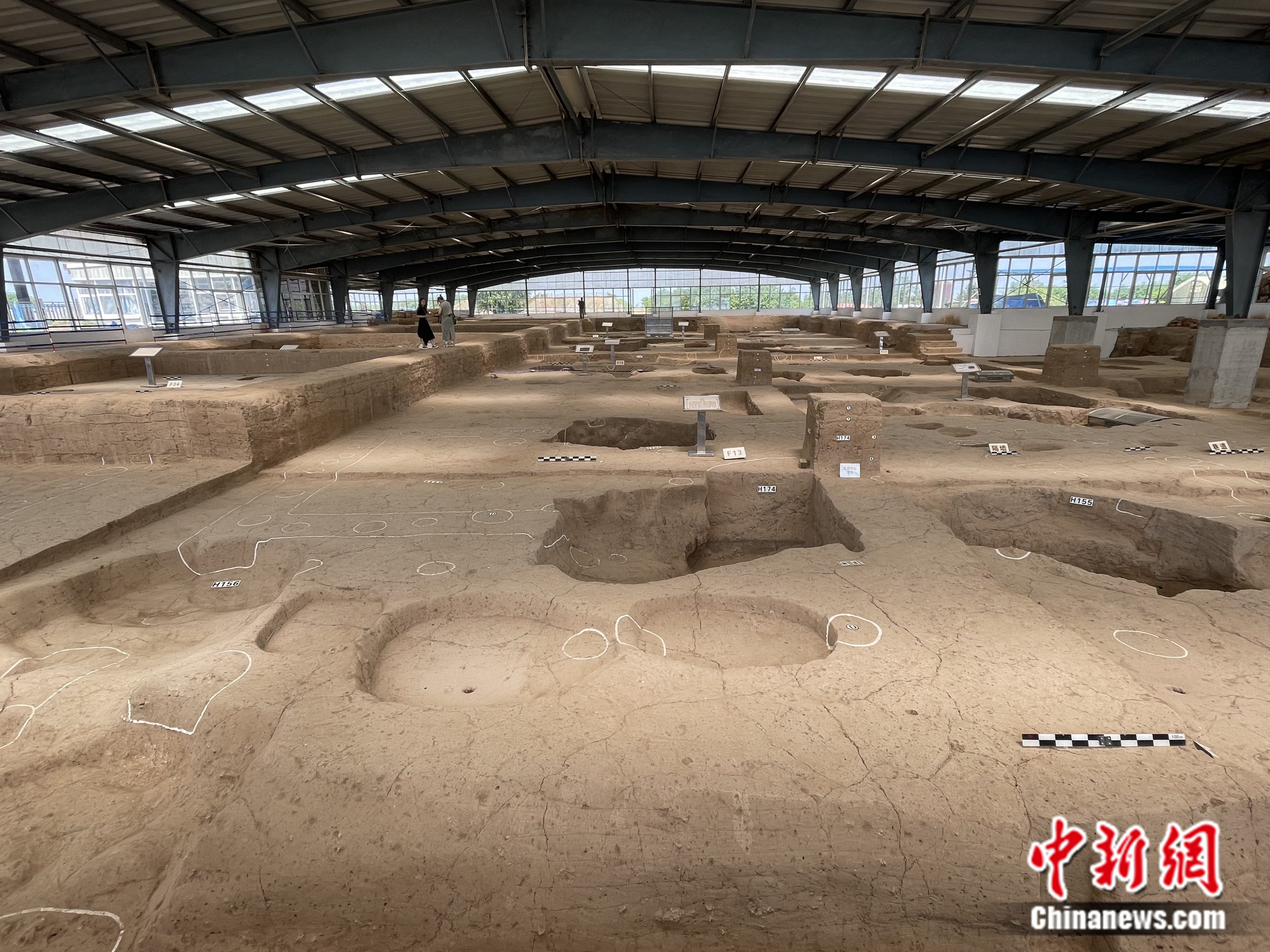 雙槐樹遺址北依黃河,西瀕伊洛河,南望嵩山,恰好位于伊洛河與黃河交匯處的高臺地上。受黃河改道影響,雙槐樹遺址北部被侵蝕,現(xiàn)存面積約117萬平方米,發(fā)現(xiàn)有仰韶文化中晚階段三重大型環(huán)壕、圍墻封閉式大型中心居址區(qū)、院落式夯土基址、四處經過嚴格規(guī)劃的大型公共墓地、三處夯土祭壇等重要遺跡,并出土了豐富的仰韶文化遺物。