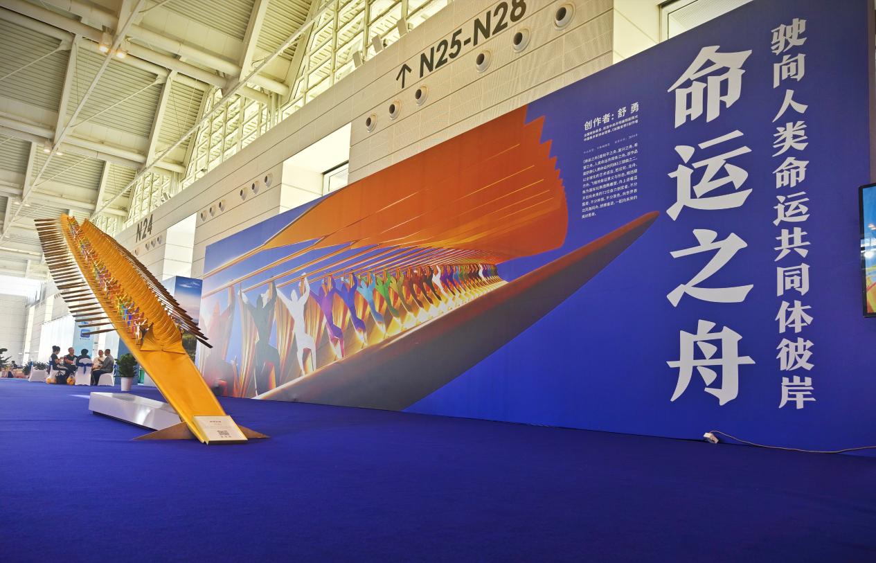 《命運(yùn)之舟》雕塑作品以巨輪、龍舟、方舟、飛船的象征意義與形態(tài),概括提煉為國(guó)際化新圖騰雕塑,舟上迎著藍(lán)天劃向未來(lái)的72位奮力劃槳者,不分國(guó)度、不分種族、不分膚色,這是世界人民風(fēng)雨同舟、命運(yùn)共同的象征。其宏偉的規(guī)模、深刻的寓意和精湛的藝術(shù)手法,成為本次文旅博覽會(huì)的一大亮點(diǎn)。