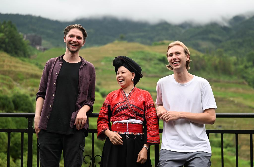 大寨村村民潘鳳蘭(中)在她家民宿外和兩位德國游客交流(6月26日攝)。新華社記者 趙子碩 攝