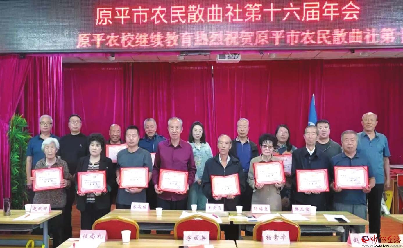 散曲社朗誦部的曲友們在悠揚音樂聲中,激情澎湃地朗誦著五谷飄香的農民散曲,20多名優(yōu)秀社員受到表彰,展示出原平農民散曲的喜慶豐收景象?!霸娙绯?,農民種曲名聲在,情如火,南腔北調心澎湃。曲如海,同舟共濟承傳愛,暖如春,一年四季花不敗?;ㄩ_滿地鮮,曲韻熔天籟,好一個震驚曲界田園派。”這首散曲《正宮·塞鴻秋》道出了散曲社社員們的心聲。