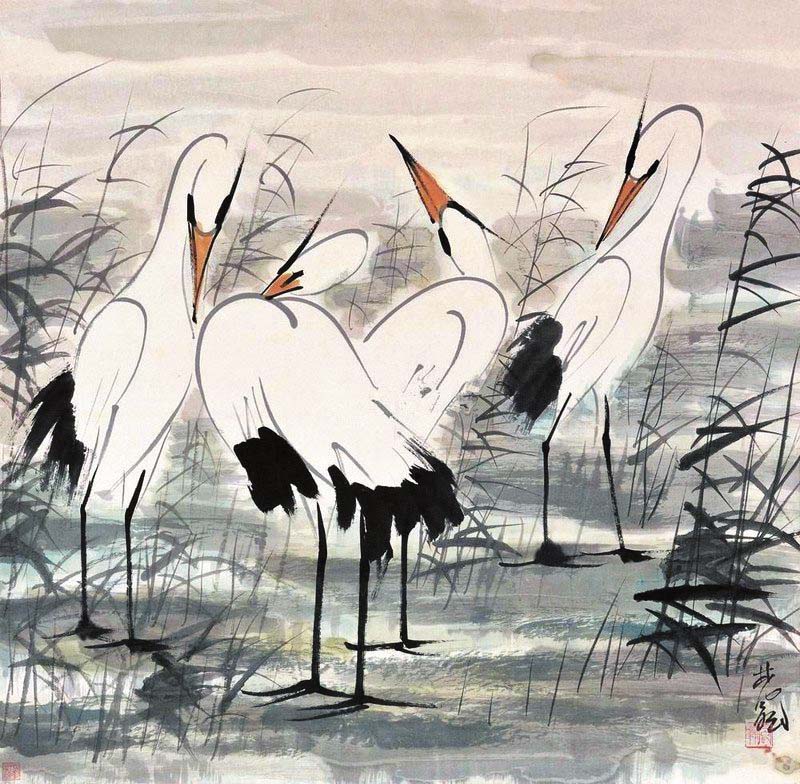 到了近現(xiàn)代,傳統(tǒng)文藝思想開始發(fā)生轉變,呂澂、康有為等人在繪畫領域提出改良思想,鶴主題的繪畫也有所變化。在林風眠創(chuàng)作的《群鶴圖》《雙鶴圖》《白鶴》等作品中,既可以看到中國畫白描的影子,又可以感受到西方速寫技法的影響?!度胡Q圖》由幾只立于廣袤水草的白鶴構成,它們姿態(tài)各不相同。與鶴之閑適姿態(tài)相對應的是隨風浮動的蘆葦,它們在微風吹拂下雖形態(tài)萬千,但并不雜亂,在總體偏暗的色調中顯出和諧之味?!峨p鶴圖》表現(xiàn)了鶴的輕盈姿態(tài),兩只鶴步伐保持一致,展示出閑適自得之感。林風眠筆下的鶴,顯然沒有古代繪畫中仙風道骨、富貴長壽之意,與寫意之鶴相比,其作品里的鶴與自然萬物融為一體,表達出強有力的現(xiàn)代語言。