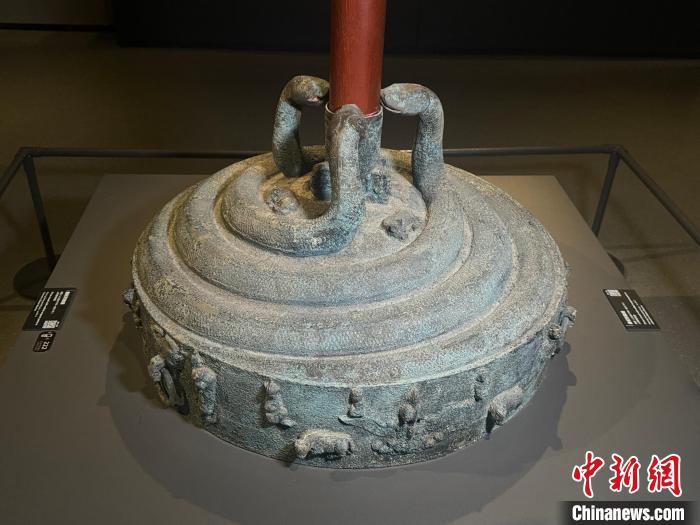 1月22日至3月2日,山西青銅博物館推出 “靈蛇獻(xiàn)瑞——乙巳蛇年生肖文物大聯(lián)展”。圖為戰(zhàn)國(guó)盤蛇鼓座。 中新社記者 楊靜 攝