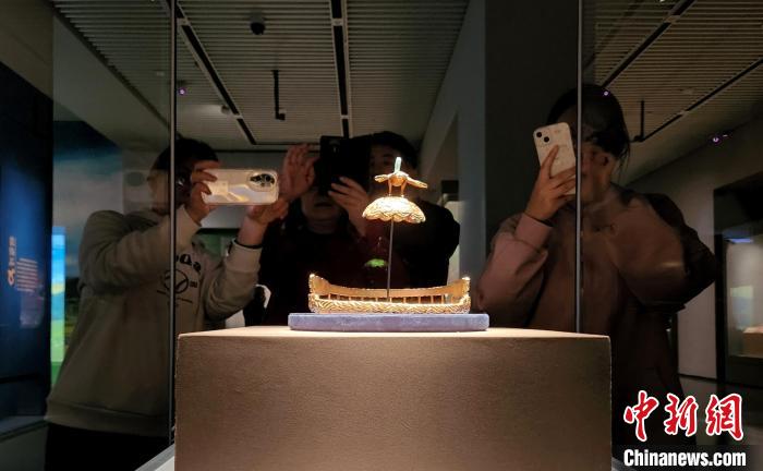 在山東博物館鄂爾多斯青銅文明展現(xiàn)場,觀眾欣賞匈奴鷹頂金冠。趙曉 攝