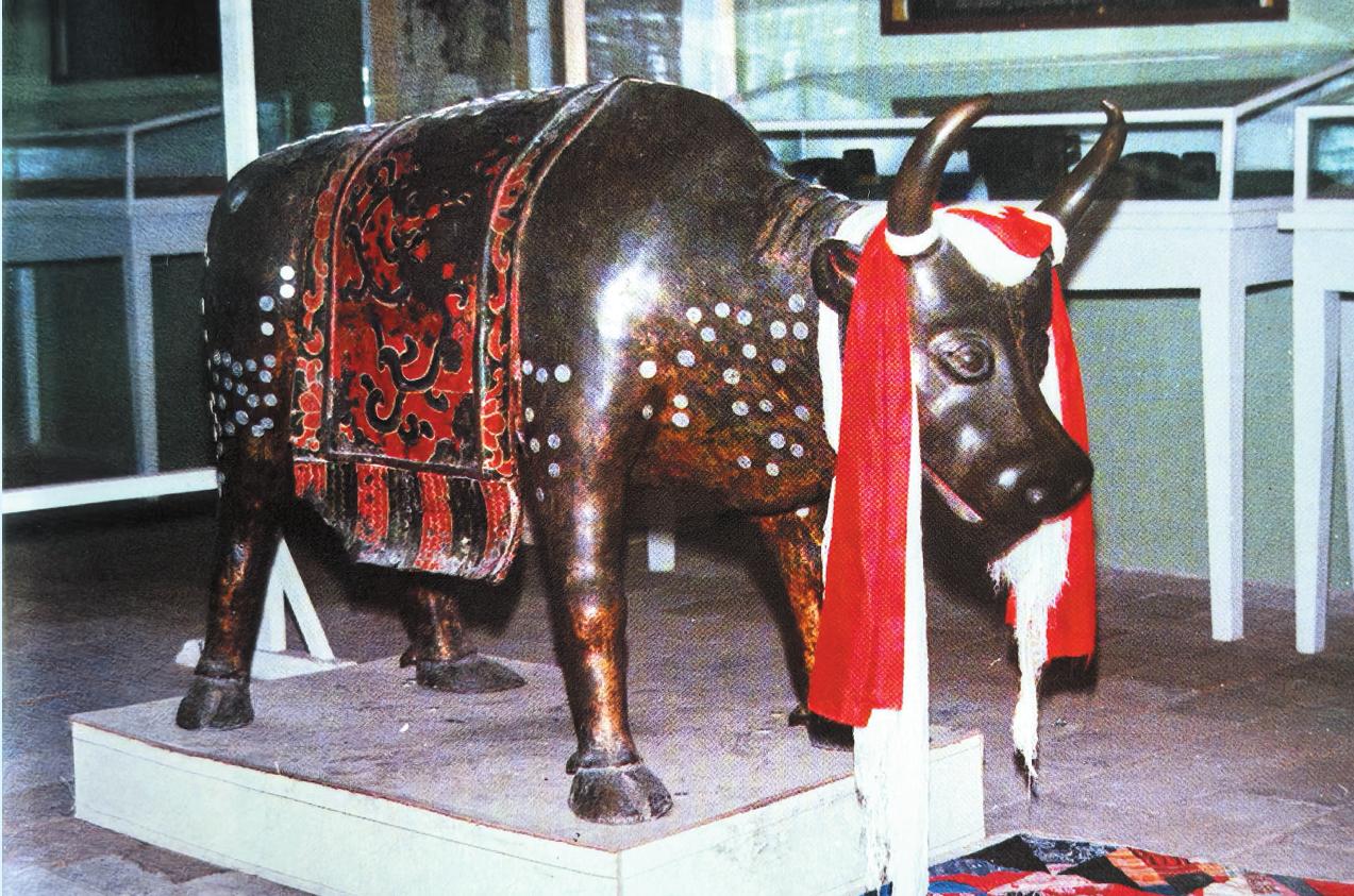 五臺山保存著一尊工藝精細(xì)、形態(tài)逼真、傳神入化的明代銅牛。這尊堪稱鑄造藝術(shù)品中佳品的銅牛,收藏在顯通寺藏珍樓內(nèi),通高85厘米,長146厘米。它體魄雄偉,頭向前伸,分足而立,兩角內(nèi)收,閉嘴蓄力,圓目正視,奮力前行。銅牛四足協(xié)調(diào),造型逼真。銅牛的腰部有披墊,披墊上面繪有各種彩色花紋。銅牛原來還拉著一輛精致的銅車。車棚、輪、軸及車上的繩索均為銅質(zhì)。文物部門鑒定其為國家一級文物。