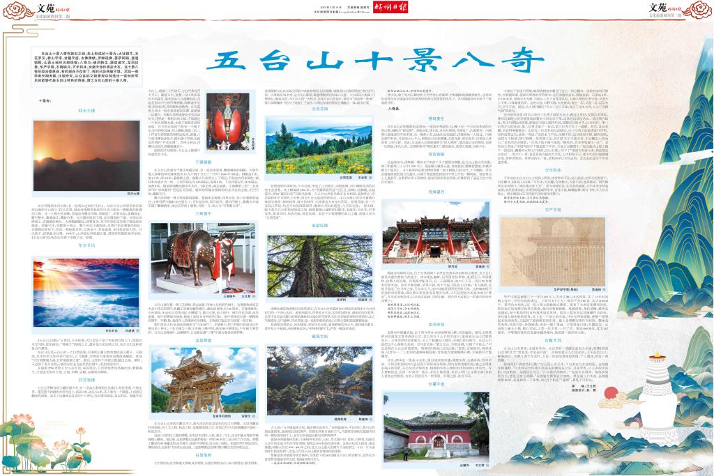 五臺山十景八奇有新舊之別,史上形成的十景為:大社銅牛、玉花羅漢、碧山字塔、臺麓字崖、古佛牌樓、羅睺現(xiàn)佛、菩薩銅鍋、顯通銅殿、山西土地和五郎鐵棍;八奇為:佛洞轉(zhuǎn)生、摩崖造字、龍洞幻景、華嚴(yán)字塔、石罅映月、萬年積冰、臺巔天池和清涼大石。這十景八奇歷經(jīng)滄桑更迭,有的現(xiàn)在不存在了,有的已經(jīng)殘破不堪。后經(jīng)一些學(xué)者長期考察,比較研究,從眾多的文物景觀中篩選出一些世所罕見的能夠代表五臺山特色的奇景,謂之五臺山新的十景八奇。