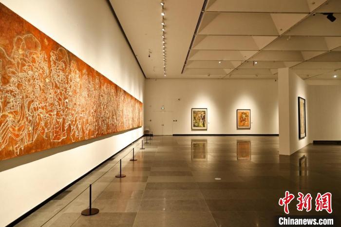 展廳現場展示18余米長的巨幅布面重彩作品《伏媧紋銘圖》。 主辦方供圖