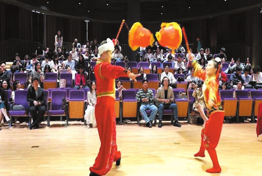 活動現(xiàn)場,藝術團團長劉延鳳作為主講人,將黃河岸邊的千年回響娓娓道來。她從“戶有弦歌新治譜”的記載,講到被列入國家級非遺的榮光;從高亢遼闊、自由奔放的“山曲”風味,解析融合三省民間音樂元素的“二人臺”小戲的獨特魅力。多位優(yōu)秀演員聯(lián)袂登臺,他們用精湛的技藝將這份厚重的文化遺產鮮活呈現(xiàn)。市級非遺代表性傳承人鄔光演唱的《放羊漢唱起爬山調》,一聲出口,仿佛將黃土高原的溝壑縱橫與黃河的奔騰不息盡數(shù)帶到現(xiàn)場;優(yōu)秀青年演員王佳、楊慧、鄔強等演繹的《河曲人愛把山曲唱》《打藍靛》《壓糕面》等多首河曲民歌二人臺的經典曲目與劇目,展現(xiàn)了民間生活的喜怒哀樂,濃郁的鄉(xiāng)土氣息與真摯情感深深打動了在場師生。