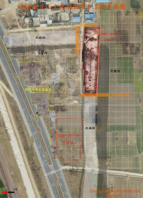 2020年禹會(huì)村龍山文化城址考古工作平面圖。匯報(bào)者供圖 安徽蚌埠禹會(huì)村遺址發(fā)現(xiàn)并確認(rèn)一座龍山文化城址,年代距今4400年至4100年,整體規(guī)模超過18萬平方米?,F(xiàn)存東、北兩段城墻,長300米至600米。城墻均堆筑而成,僅存城墻基礎(chǔ),寬18米至25米。