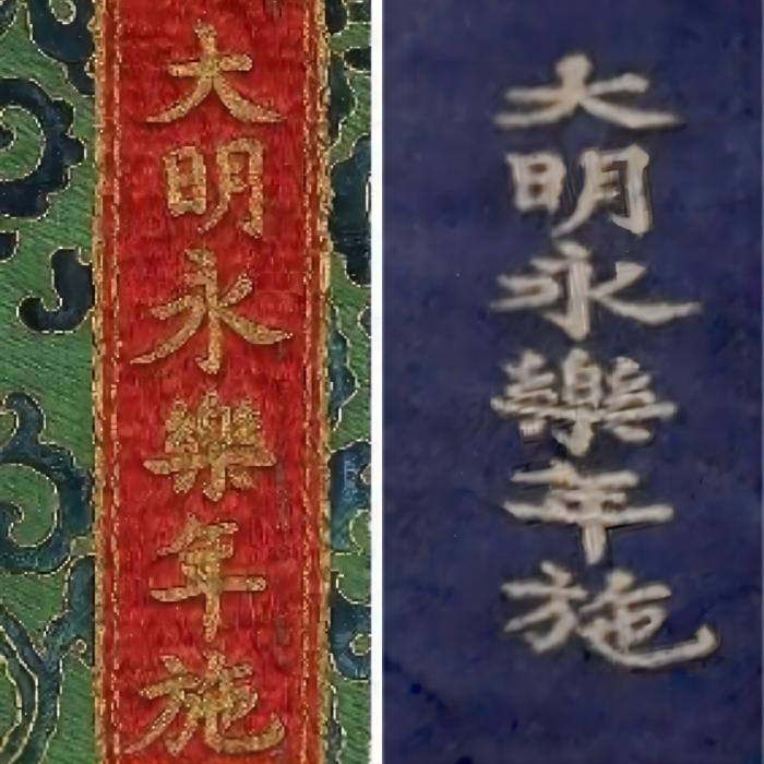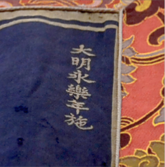 ▲明永樂織錦勝樂金剛唐卡(局部)。 這是一幅與眾不同的勝樂金剛唐卡。 不同于傳統(tǒng)勝樂金剛眉頭緊鎖、怒目圓睜的造型,這幅唐卡里的勝樂金剛眉如水波、眉眼帶笑。難道佛像亦有不同的“表情包”嗎? 01 唐卡與明成祖朱棣的神奇聯(lián)系 這幅與眾不同的唐卡,被稱作“明永樂織錦勝樂金剛唐卡”,現(xiàn)收藏于西藏山南博物館。此幅唐卡通高526厘米、寬319厘米,畫心高286厘米、寬208厘米,形制巨大;畫幅中心為勝樂金剛與多吉帕姆雙身,其造型既符合量度又生動(dòng)傳神;主尊身后裝飾著桃形的火焰紋,構(gòu)圖簡(jiǎn)潔大氣;以藏青色絲綢為底,以金色絲線織造圖紋,色彩華貴而典雅;畫面右上角六字金色漢文楷書“大明永樂年施”題款。