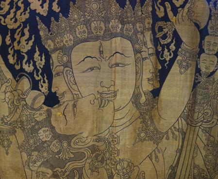 ▲永樂御制紅閻摩敵刺繡唐卡(局部)。(圖片來(lái)源:中新網(wǎng))