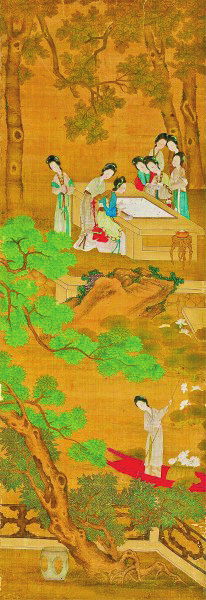宋代畫作亦呈現(xiàn)女性服飾之濃郁色韻。畫作《女孝經(jīng)》中的女性穿著,有淡綠衫配淡紫裙、白衫配淡綠壓花裙、淡藍衫配淡黃裙等,披帛外搭相應為淡藍、淡紫和淡黃,女性服色呈現(xiàn)出素淡搭配之主流?!冬幣_步月圖》為宋代畫家劉宗古創(chuàng)作,畫中女子裙子均為白色,衣著素淡簡樸,氣質(zhì)高雅脫俗?!额率钟^花圖》中服色搭配更為柔和,女主人上穿淡紫窄袖長襦,下穿白色長裙,外搭淡黃披帛;侍女穿淡綠袍衫搭淡黃腰間寬巾,亦有穿淡藍袍衫搭白色腰圍?!肚迕魃虾訄D》為中國古代著名繪畫,由畫家張擇端創(chuàng)作,畫中少有女性,普通勞動婦女多穿青色裙或腰系青花圍巾,有身份的女子戴蓋頭、穿紫色褙子,展現(xiàn)出簡約、素雅的宋代服飾風格。