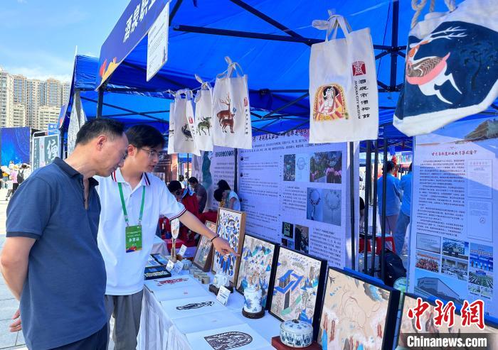 7月14日,酒泉職業(yè)技術學院學生王皓向觀眾介紹敦煌文創(chuàng)作品。中新社記者 丁思 攝