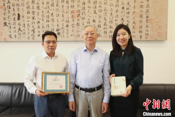 李紅強(qiáng)總編輯(左)代表人民文學(xué)出版社向國(guó)家圖書館捐贈(zèng)《莫礪鋒演講錄》一種三冊(cè),霍瑞娟副館長(zhǎng)(右)代表國(guó)家圖書館接受捐贈(zèng)并頒發(fā)證書。儀式后雙方與莫礪鋒教授(中)合影。 主辦方供圖