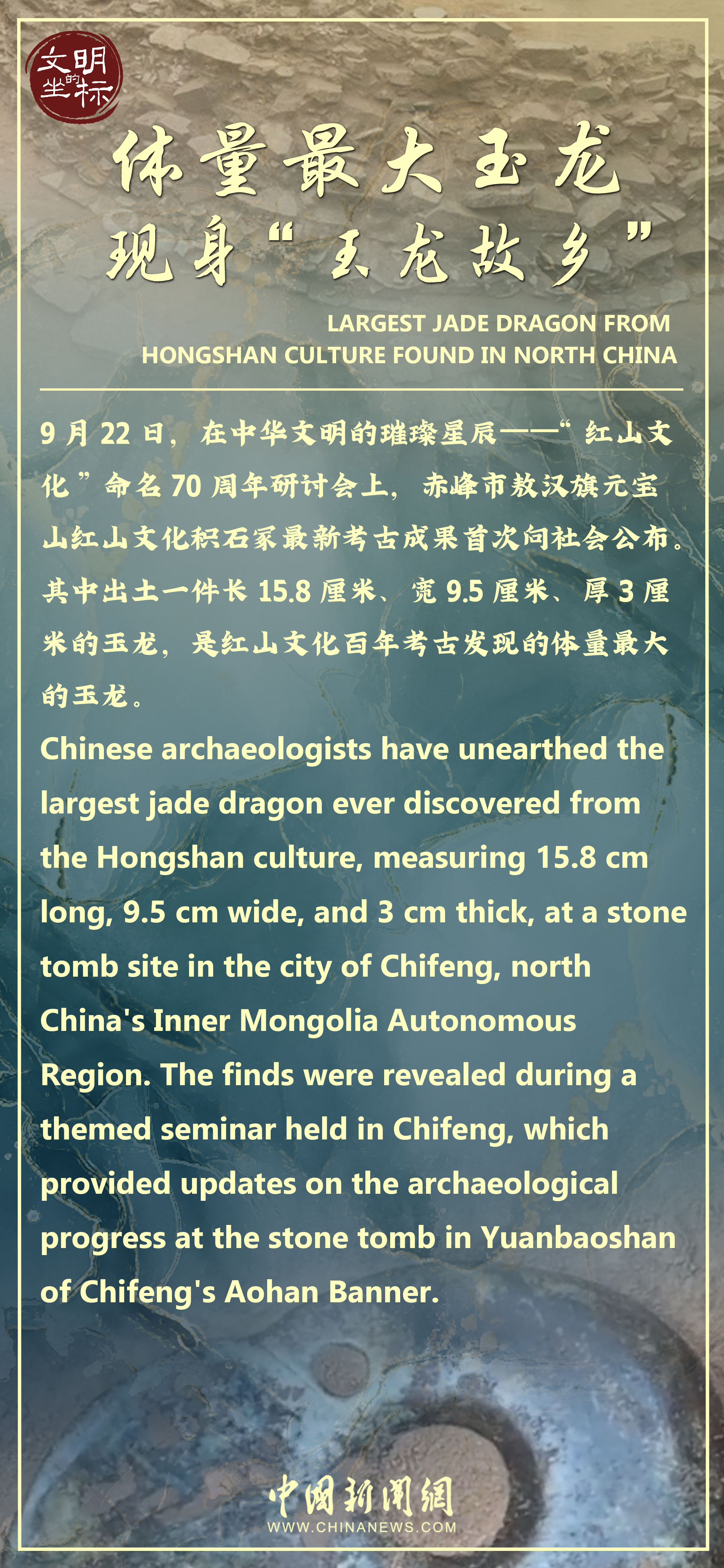 紅山文化因內(nèi)蒙古赤峰市紅山后遺址的發(fā)現(xiàn)、發(fā)掘而得名,至今已有70年。近日,紅山文化考古再一次“上新”。9月22日,赤峰市敖漢旗元寶山紅山文化積石冢最新考古成果首次向社會公布,其中出土的一件長15.8厘米、寬9.5厘米、厚3厘米的玉龍,是紅山文化百年考古發(fā)現(xiàn)的體量最大的玉龍?!褒垺?,中國人最親切的身份認(rèn)同,也是紅山文化最突出的元素之一。早在1971年,被考古界譽(yù)為紅山文化象征的“中華第一龍”——紅山碧玉龍在赤峰市紅山文化遺址出土,赤峰市也因此被譽(yù)為“中華玉龍之鄉(xiāng)”。來“玉龍故鄉(xiāng)”,探尋中華文明的古老根脈。
