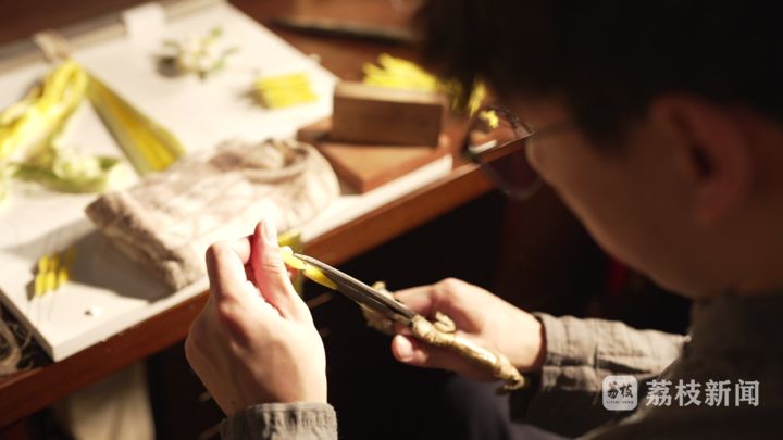 盡管對初學者來說,每一個步驟都有不同的難點,但最讓嚴鑫記憶猶新的還是打尖留下的疼痛?!按蚣饩褪菍⒔q條修剪成需要的形狀,需要左右手的配合,右手拿剪刀,左手的食指和拇指進行捻轉。一天的工作當中我們基本上大部分時間都是在做這個過程。剛開始學的時候晚上睡覺都會疼醒,左手的食指都沒有辦法完全彎曲下去?!?/p>