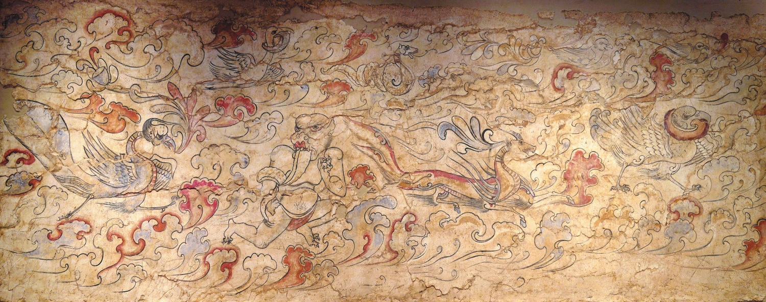 忻州北朝墓墓道東西兩壁的壁畫非常令人震撼,是同時(shí)期墓葬壁畫中保存較完整、精細(xì)的一處,對(duì)研究北朝社會(huì)生活、繪畫藝術(shù)、古代建筑史都有非常重要的意義。壁畫第一層為升天景象,繪有神怪異獸、龍鶴仙人、風(fēng)伯雨師等形象;第二層以郁郁蔥蔥的山林為背景,描繪了備馬出行和狩獵場(chǎng)景;第三、四層依舊以山林為背景,繪有隊(duì)列出行圖。此外,墓道北壁還繪有一座規(guī)模宏大的廡殿頂木結(jié)構(gòu)建筑。墓室壁畫雖遭破壞,但分層圖像依稀可見,布局基本清楚。第一層為星象圖,東壁上方還殘存三足烏的形象;第二層為四神圖,形體巨大;第三層為牛車鞍馬圖,其中東壁為牛車,西壁為鞍馬,華蓋羽傘,隨行人物依稀可辨。