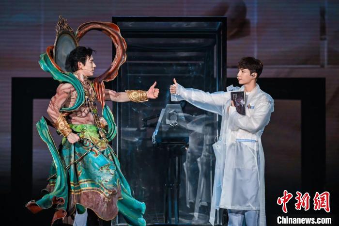 《受到召喚·敦煌》運用了“AI+3D+即時影像+真人動畫融合”技術(shù),以高色階大屏,打破了傳統(tǒng)的觀演模式和舞臺空間,巧妙地融合了歷史與未來、東方與西方文化元素,構(gòu)建起沉浸式觀演空間。舞臺上,當(dāng)數(shù)字修復(fù)的莫高窟壁畫徐徐展開時,21世紀(jì)30年代的敦煌數(shù)字研究中心實習(xí)生張燃與20世紀(jì)30年代的“敦煌守護(hù)神”常書鴻,跨越一個世紀(jì),展開時空對話,給現(xiàn)場觀眾留下了深刻印象。
