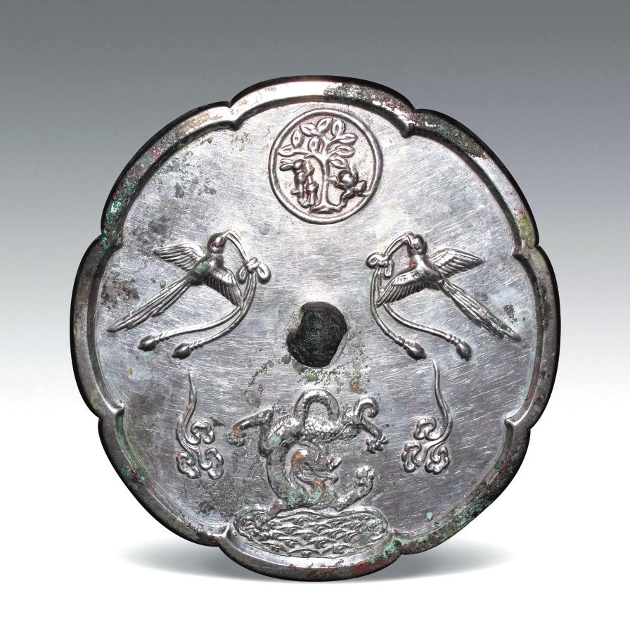 唐代張匯的《千秋鏡賦》云,千秋鏡背“或鑄或镕,是磨是削。刻以為龍,鏤以成鵲”,《文苑英華》亦載“鵲飛如向月,龍盤以映池”,與盤龍雙鵲月宮鏡上的紋飾恰好相符。盤龍、雙鵲、祥云,月宮中的玉兔、蟾蜍、桂樹,成為此類銅鏡的畫面主體,引發(fā)人們對月宮的美好想象。