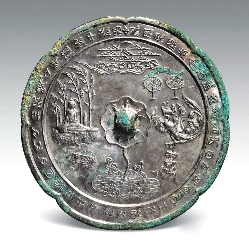 真子飛霜鏡一般都是圓形、葵花形,而西安出土的一面鏡形十分罕見,為亞字形。鏡背上方云海托月,半個月亮浮上來。真子飛霜鏡的形制,多在細(xì)節(jié)上略有差異。除了鏡鈕上方有“真子飛霜”四字,或者有一只飛翔的仙鶴之外,還有一種在鏡緣飾篆書體銘文,鏡銘為:“鳳凰雙鏡南金裝。陰陽各為配,日月恒相會。白玉芙蓉匣,翠羽瓊瑤帶。同心人,心相親,照心照膽保千春?!?/p>