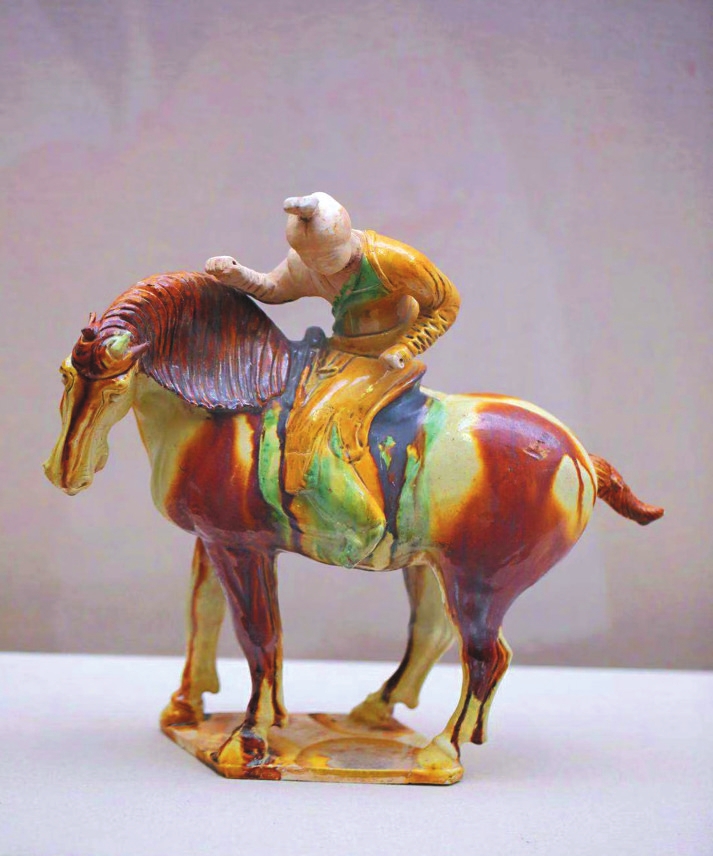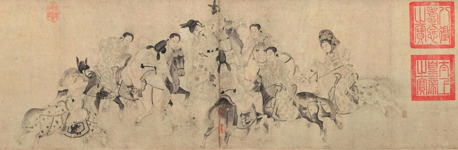 唐代女子也熱愛打馬球,《明皇擊球圖》展現(xiàn)了唐玄宗與后宮妃嬪打馬球的場景,河南洛陽唐代王雄誕夫人魏氏墓曾出土四件三彩打馬球女俑。唐代詩文中也有女子打球的記載,王建《送裴相公上太原》中寫“千群白刃兵迎節(jié),十對紅妝妓打球”,張籍的《寒食內宴二首》亦云“廊下御廚分冷食,殿前香騎逐飛球”的詩句。由于馬球運動的流行,唐代有很多與馬球相關的文物,流傳至今的馬球、球桿、球場碑石、繪畫、泥塑等數(shù)不勝數(shù)。