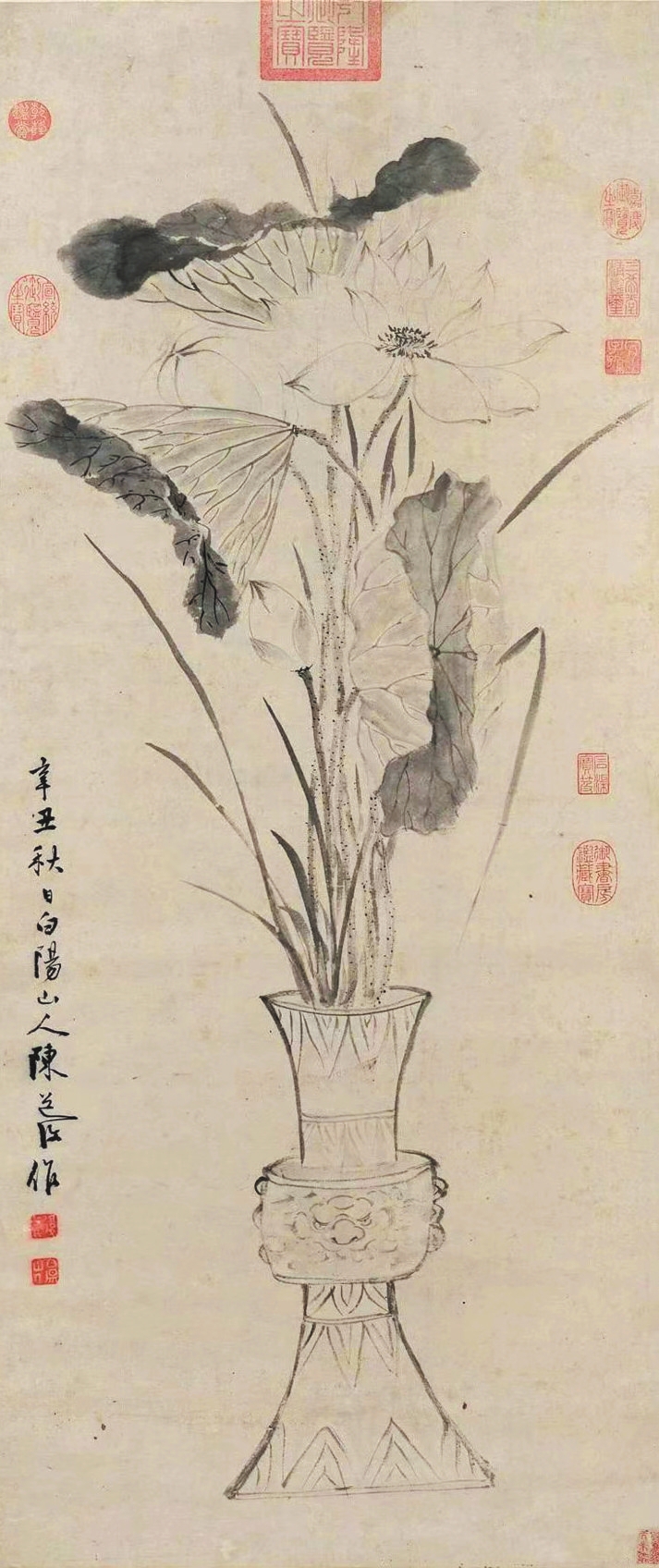 陳淳的《瓶荷寫生圖》中,一青銅花觚內(nèi)插數(shù)枝荷花,細(xì)葉菖蒲點(diǎn)綴其間。向上伸展的枝葉幾乎占滿畫面,盡顯夏日花草的勁挺之氣與蓬勃生機(jī)。此作給人最大的視覺感受是不拘一格的瀟灑筆觸與靈動(dòng)造型,尤其靠下方的兩片荷葉,以及右側(cè)彎折垂下的一片細(xì)葉,甚至顯現(xiàn)出一絲不加修飾的潦草、頹敗之感,而恰是對此等細(xì)節(jié)的保留,生動(dòng)體現(xiàn)出植物自然的生長姿態(tài)。