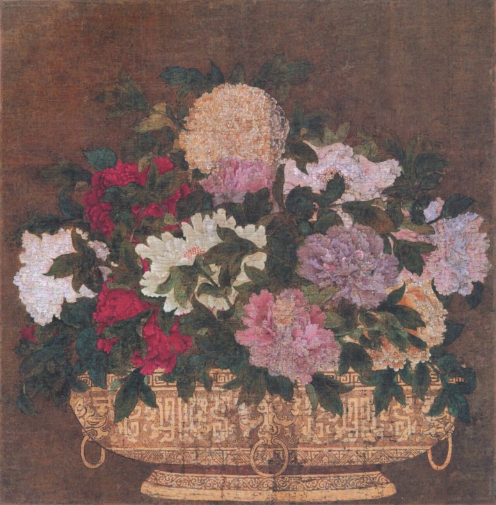 日本知恩院藏有一幅宋代《牡丹圖》,畫上共12朵盛放的牡丹,尺寸超大,花色各異。盛花器皿是一只類似簋的金色青銅器,器形圓滿端莊,紋飾線條飽滿,連拉環(huán)都被畫成滿圓,材質似為青銅,也可能是金?;ǘ洳宸排c花器呈“品”字偏圓形布局。細密的絹絲雖已襤褸,但其靜穆而雍容華貴的氣質仍令人震撼——它是傳世牡丹圖中最令人印象深刻的一幅。