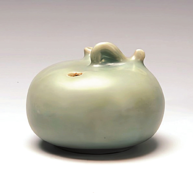 杭州博物館館藏的南宋龍泉窯粉青釉柿形瓷水注,宛如一枚剛摘下的青柿,小巧玲瓏,一掌可握。這件器物高4.6厘米,口徑6.2厘米,底徑3.8厘米,中空扁圓的鼓腹設(shè)計(jì),盡顯靈動(dòng)之態(tài)。頂部中心微凹,環(huán)繞的五片柿葉花紋若隱若現(xiàn),突破了傳統(tǒng)“一尖兩彎”的柿蒂紋范式,更添清新意趣。葉片間隙貼飾S形細(xì)泥條,構(gòu)成半圓形困藤鈕,精巧別致。肩部一側(cè)設(shè)出水短流,另一側(cè)留圓形注水孔,暗藏巧思:使用時(shí)先注滿水,移至硯臺(tái)旁以手指堵住注水孔,借負(fù)壓鎖住水流,再根據(jù)研墨需求緩緩移開手指控制出水量,實(shí)則是利用大氣壓強(qiáng)差調(diào)控水流的精妙設(shè)計(jì),在方寸之間實(shí)現(xiàn)了功能與美感的完美融合。器物通體施粉青釉,釉面光潤細(xì)膩,足底處的火石紅痕跡,是歲月留下的鮮明印記。其精致的器型與瑩潤的釉色,盡顯文人雅士的清雅審美,既是南宋文房的精品之作,更見證了龍泉窯在青瓷史上的美學(xué)巔峰。