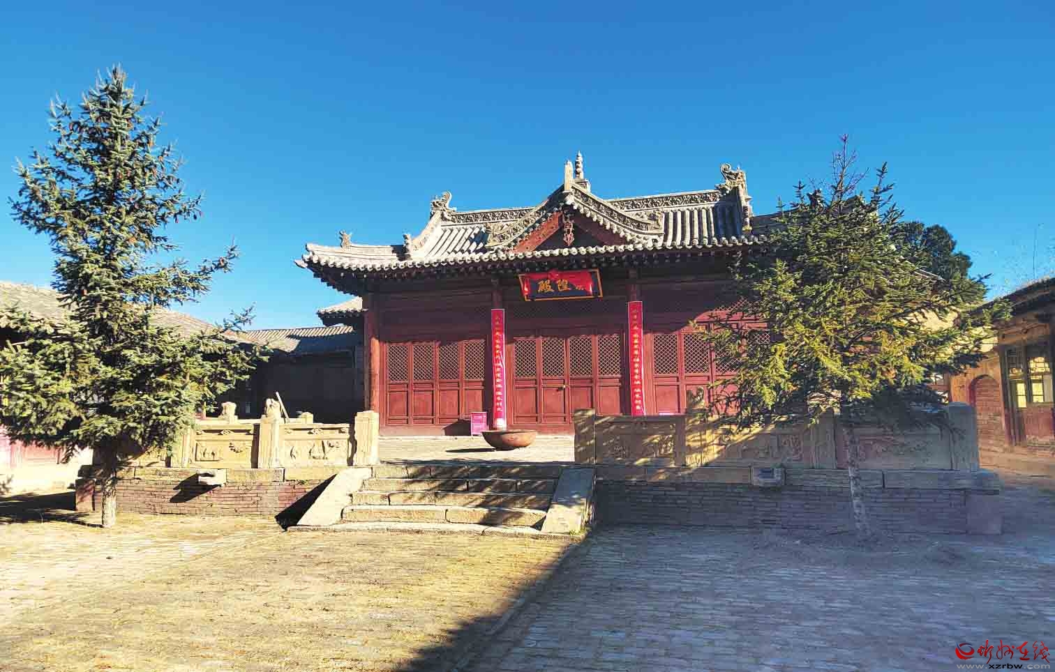 一進院布局,中軸線現(xiàn)存有正殿1棟,兩側(cè)建有配殿,西北角建有偏殿。正殿磚砌臺基,面寬五間,進深六椽,七檁前后廊式構(gòu)架,前檐斗拱為五踩,后檐為三踩斗拱,單檐懸山頂。前設(shè)月臺,建有抱廈三間,單檐歇山頂?,F(xiàn)新塑像3尊,正殿梁架有彩繪。