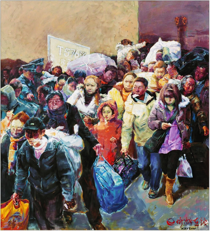 《春潮——回家過年》這幅作品是典型、真實的社會現(xiàn)實和人性本真的寫照,這個瞬間定格了一段讓多少人刻骨銘心的記憶,敘述了周期性的人類大遷徙——春運。該畫所蘊涵的是中國人心中那份最飽滿的希望。旅客是彼此都不認(rèn)識的陌生人,為了一個回家的目的,毫無距離地擠在一起,人物個性鮮明。畫家具有強大的創(chuàng)作能力和藝術(shù)表現(xiàn)力。(邢晨聲 文)