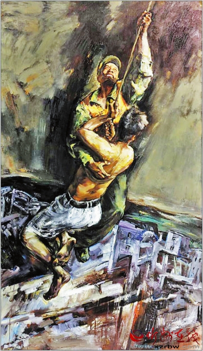 作品《空中救援》中,觀者首先感受到的就是難度。主題表現(xiàn)的事件難度和畫面表現(xiàn)處理的難度交織在一起,讓我們在驚險、焦急的心理壓力下感受到生命的脆弱??罩芯仍闪松奈ㄒ煌ǖ?。救援同樣是險象環(huán)生、驚心動魄。從畫面處理技巧上是一種挑戰(zhàn),天空與地面的透視關(guān)系,動感與靜態(tài)的對立統(tǒng)一,那種命懸一線的緊迫感對心理的沖擊力,通過大刀闊斧的刮刀、筆觸處理,和蒼涼緊迫的色調(diào)關(guān)系,準(zhǔn)確地展示了主題思想,大膽省略了一些不必要的細(xì)節(jié)描寫。用大筆觸、大色塊表現(xiàn)背景的壓抑和險峻,救援主體成為沖破這一重壓的希望之色。沒有去刻意刻畫天與地的真實場景,簡潔概括但不呆板空洞,這種果斷的駕馭,是續(xù)鶴賢真實實力的體現(xiàn)。 邢晨聲 文