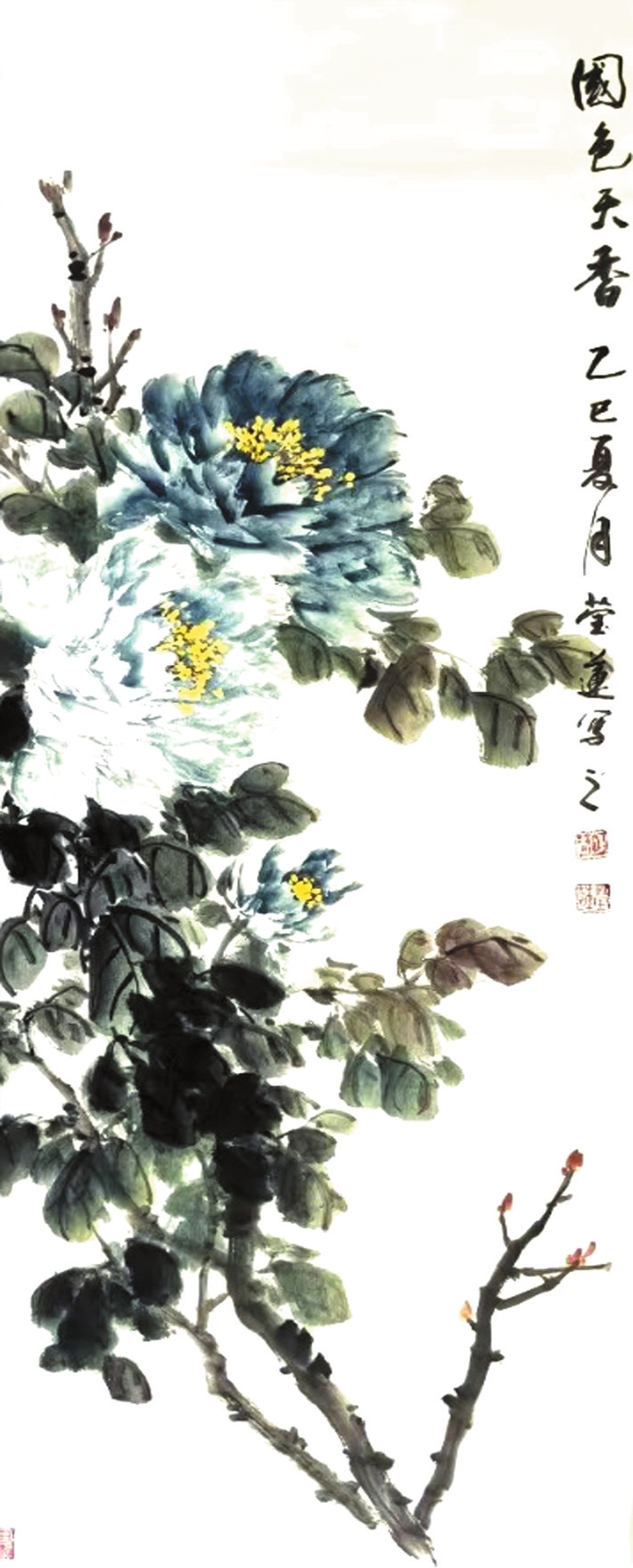 胡瑩蓮的筆墨并非刻意炫技,而是循著“應物象形”之理自然生發(fā):牡丹花瓣以淡彩層層暈染,輔以墨線勾勒輪廓,既顯牡丹的華貴之姿,亦存筆墨的清勁骨力;紫藤枝條以側(cè)鋒揮掃而出,既有“折釵股”般的圓勁質(zhì)感,亦見藤蔓的靈動意趣。恰如北宋畫家郭熙在《林泉高致》中所言的“筆補造化”,胡瑩蓮以筆墨為媒介,貫通物象的自然本真與人文意蘊。