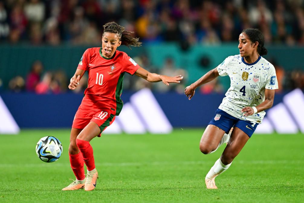 8月1日,葡萄牙隊球員杰茜卡·席爾瓦(左)與美國隊球員吉爾馬拼搶。新華社記者朱煒攝