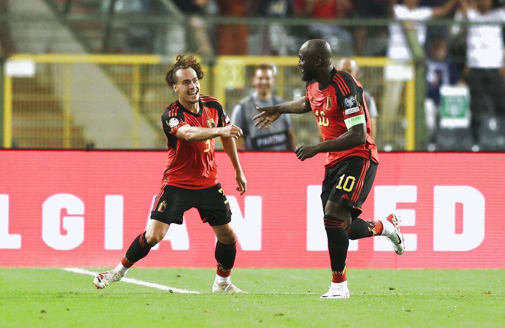 9月12日,比利時隊球員盧卡庫(右)進球后和隊友蒂特慶祝。新華社記者趙丁喆攝