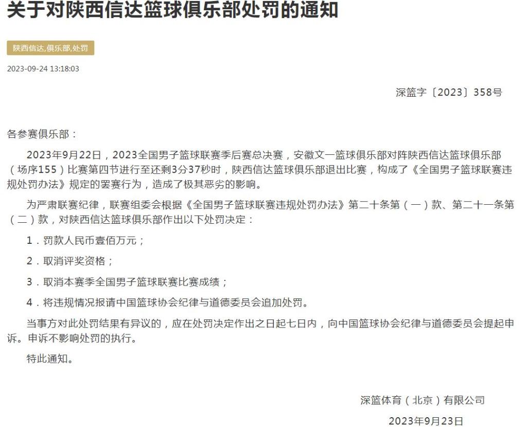 中國(guó)籃協(xié)官網(wǎng)公布的“關(guān)于對(duì)陜西信達(dá)籃球俱樂部處罰的通知”