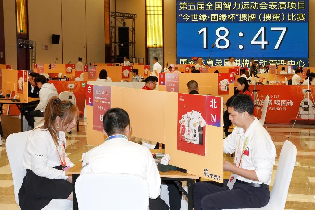 這是摜蛋項目首次進入智運會,比賽設(shè)男子雙人賽、女子雙人賽、混合雙人賽3個競賽項目,執(zhí)行國家體育總局棋牌運動管理中心審定的《競技摜蛋競賽規(guī)則(試行)》,分預賽、決賽兩個階段進行。預賽采用場分制瑞士積分編排賽,進行7輪比賽,決賽采用豪威爾制,進行9輪比賽。比賽均采用計算機預制比賽用牌,全場同牌,以得分決定名次。