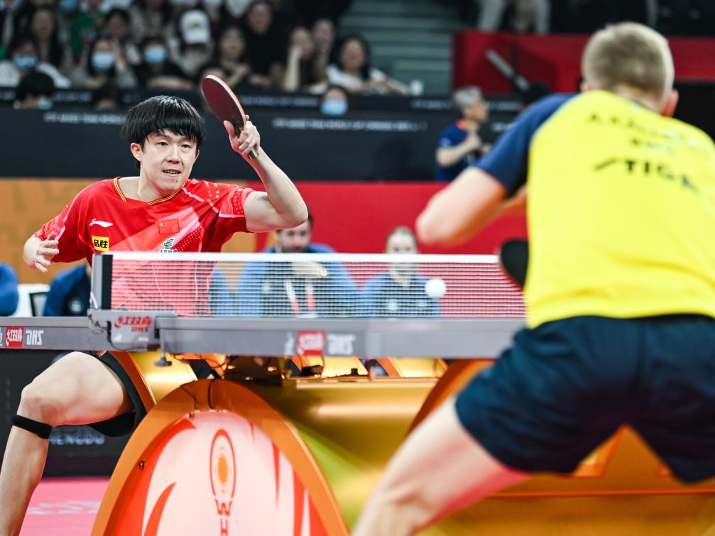 12月4日,中國(guó)隊(duì)選手王楚欽在男單比賽中回球。新華社記者 王曦 攝