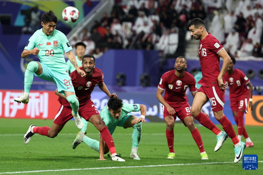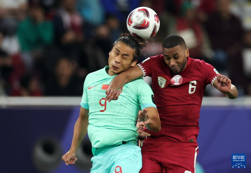 1月22日,中國(guó)隊(duì)球員韋世豪(左一)在比賽中頭球攻門。新華社記者 賈浩成 攝 卡塔爾隊(duì)因?yàn)橐呀?jīng)提前出線,上一場(chǎng)對(duì)陣塔吉克斯坦隊(duì)的首發(fā)陣容里,只有后衛(wèi)拉維和中場(chǎng)馬沙勒本場(chǎng)繼續(xù)首發(fā)對(duì)陣中國(guó)隊(duì),其余九人坐上替補(bǔ)席。 中國(guó)隊(duì)在上半場(chǎng)表現(xiàn)得十分積極,韋世豪在第七分鐘接張玉寧倒三角回傳,一腳推射稍稍偏出近門柱。第12分鐘,張玉寧射門被后衛(wèi)擋出底線后,又在角球進(jìn)攻中完成一次頭球攻門。 中國(guó)隊(duì)最好的機(jī)會(huì)出現(xiàn)在第36分鐘。吳曦在禁區(qū)前的射門被后衛(wèi)擋到韋世豪腳下,后者近距離推射太正,被對(duì)方門將擋出,中國(guó)隊(duì)錯(cuò)失領(lǐng)先機(jī)會(huì)。 上半場(chǎng)補(bǔ)時(shí)階段,隊(duì)友把球橫掃門前,張玉寧搶點(diǎn)稍慢,隨后韋世豪頭球攻門高出橫梁。