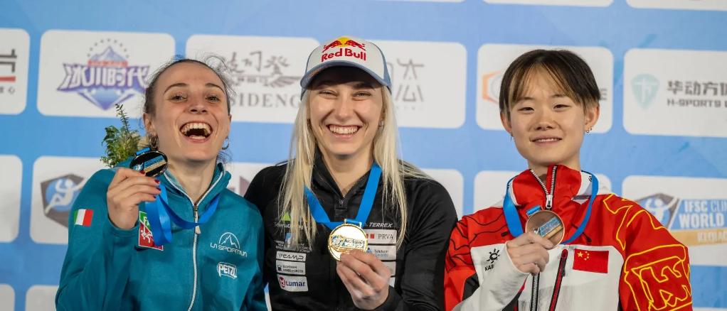 女子攀石冠軍加恩布雷特(中)、亞軍莫羅尼(左)和季軍駱知鷺(右)在領(lǐng)獎臺上合影。圖片來自國際攀聯(lián)官網(wǎng)