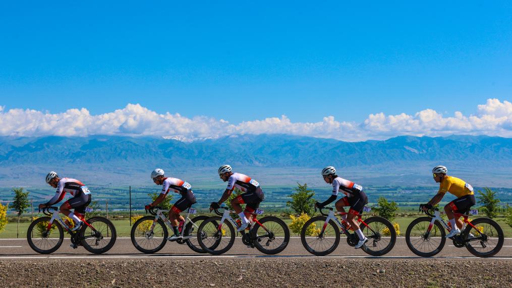 5月30日,第十六屆環(huán)賽里木湖賽第三賽段比賽中,運動員正在騎行。新華社發(fā)(于蘇甫·艾尼 攝)