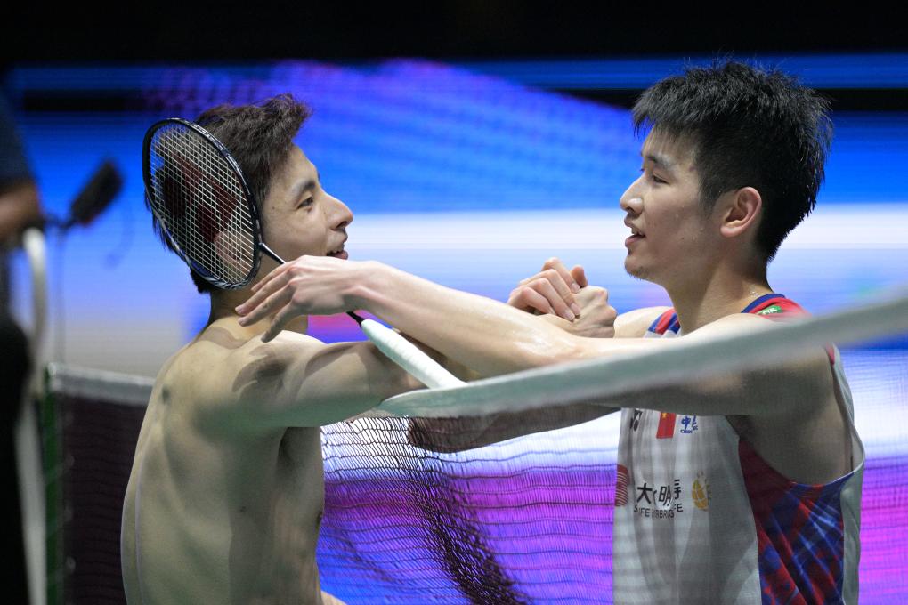 6月2日,石宇奇(左)與李詩灃在比賽后互相致意。新華社發(fā)(鄧智煒攝)